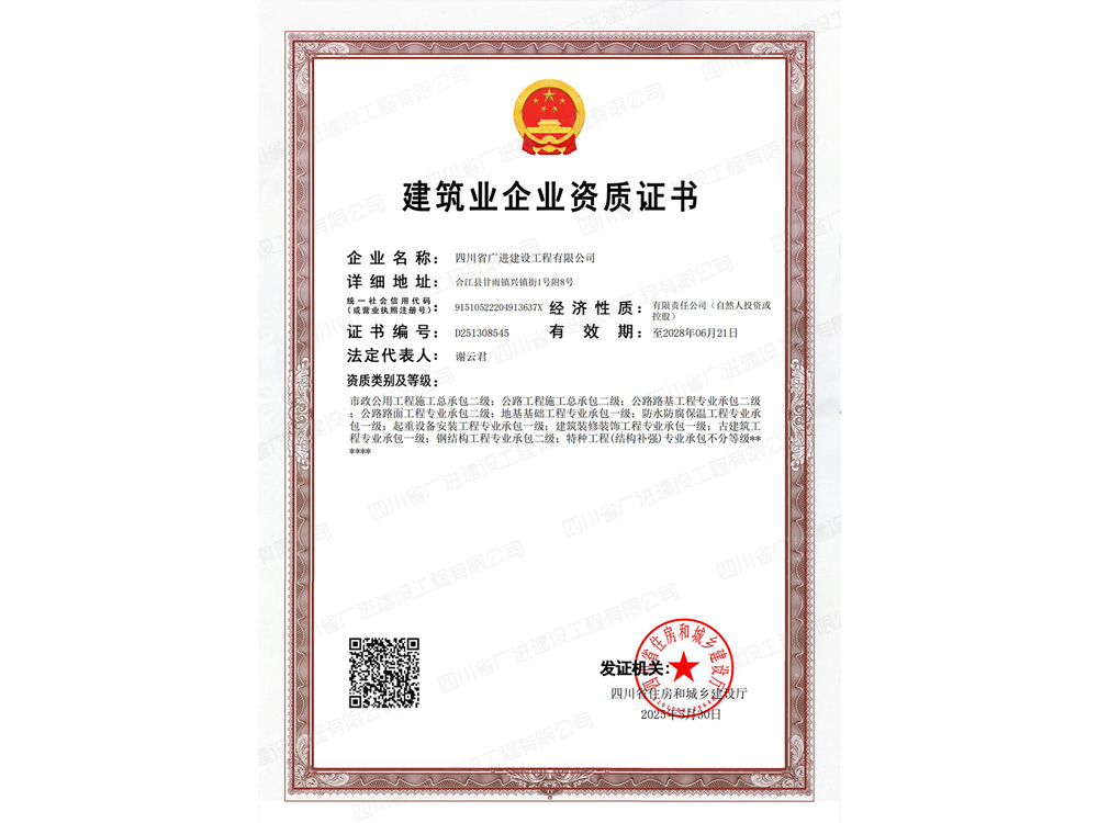目前,公司建筑工程施工總承包資質(zhì)已升級(jí)為壹級(jí)資質(zhì),公司有職工280余人,有職稱(chēng)人員113人(其中高級(jí)職稱(chēng)3人、中級(jí)職稱(chēng)32人、初級(jí)職稱(chēng)78人);各類(lèi)管理上崗人員40余人;大中專(zhuān)學(xué)歷85余人;高中專(zhuān)學(xué)歷120余人。企業(yè)法人代表兼總經(jīng)理:謝云君,注冊(cè)資金壹億伍仟萬(wàn)元,下面設(shè)有一個(gè)分公司“四川省廣進(jìn)建設(shè)工程有限公司赤水分公司”,分公司地址:貴州省遵義市赤水市太平街。